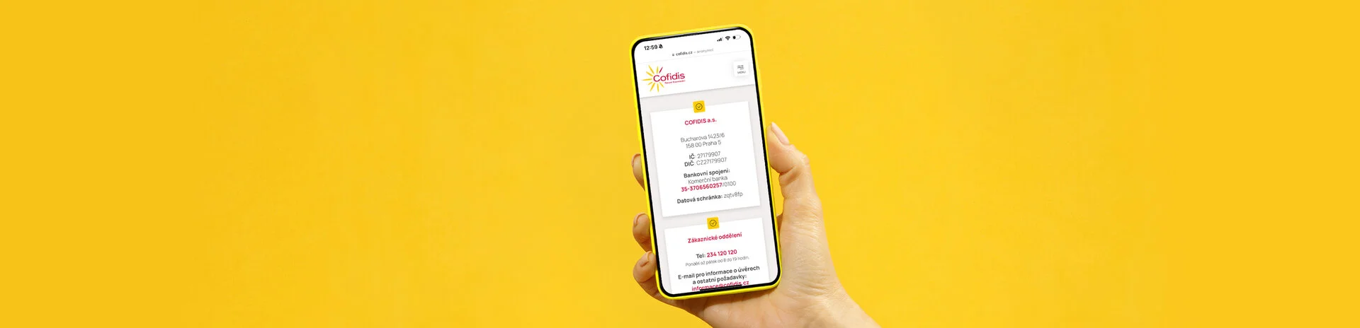 Jsme tu pro Vás na tel. 234 120 120 (Po-PÁ 8:00-19:00), na emailu informace@cofidis.cz nebo zanechte zprávu prostřednictvím kontaktního formuláře níže. Informace o přístupnosti služeb COFIDIS a.s. si můžete přečíst zde.